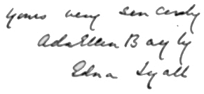 Ada's BiographyThe biography below was written in 1912. ADA ELLEN BAYLY (1857 - 1903), novelist under the pseudonym of Edna Lyall, born at 5 Montpelier Villas, Brighton, on 25 March 1857, was youngest of the three daughters and son of Robert Bayly, barrister of the Inner Temple, by his wife, Mary Winter. Her father died when she was eleven and her mother three years later. A delicate child, she was first educated at home, then in the house of her uncle and guardian, T. B. Winter of Caterham, and finally at private schools at Brighton (cf. The Surges Letters, 1902, a record of her youthful days). After leaving school she lived successively with her two married sisters. Until 1880 she resided at Lincoln with her elder sister, who had married John Henchman Crowfoot, canon of the cathedral. From 1880 till death her home was with her younger sister, wife of the Rev. Humphrey Gurney Jameson—in London until 1881, in Lincoln 1881-4, and after 1884 at Eastbourne, where she devoted much time and money to charitable and religious causes. With strong religious feeling she combined through life an earnest faith in political and social liberalism. She was a secretary of the Eastbourne branch of the Women's Liberal Association, and a warm supporter of women's suffrage. Under the appellation of Edna Lyall, which she formed by transposing nine letters of her three names and made her permanent pseudonym, Miss Bayly published in 1879 bee first book, ' Won by Waiting,' a juvenile story of a girl's life, which attracted at the time no attention, but was reissued, to her annoyance, in 1886, after she beame known, and by 1894 was in a 13th edition. There followed in 1882 her second novel, 'Donovan' (3 vols.), which dealt with her religious beliefs and spiritual experiences. Although only 320 copies were sold, the book won the admiration of Gladstone, who wrote to Miss Bayly in 1883 of its first volume as ' a very delicate and refined work of art.' An intelligent review in the ' National Reformer ' led to a correspondence with Charles Bradlaugh [q. v.], many of whose political convictions she shared. In spite of her dissent from his religious views, her liberal sentiments resented his exclusion on religious grounds from the House of Commons (1880-5). She thrice subscribed to the fund for defraying his electoral expenses. After his death on 30 Jan. 1891, she wrote for the press (in June) the appeal for a memorial fund, and subscribed to it her royalties for the half-year, amounting to 200l. With Bradlaugh's daughter, Mrs. Bradlaugh Bonner, she formed a lasting friendship. Meanwhile, on some notes supplied by Bradlaugh Miss Bayly based her novel 'We Two' (1884, 3 vols.), a sequel to 'Donovan.' The career of the secularist hero, Luke Raeburn, vaguely be that of Bradlaugh, although the main theme is the conversion of Erica Raeburn, the secularist's daughter, to Christianity. 'We Two' established the author's reputation, and drew 'Donovan' from its threatened oblivion. For the copyright of these two books she received no more than 50. But with the publication in 1885 of 'In the Golden Days,' an able historical novel of the seventeenth century, her profits grew substantial. 'In the Golden Days' was the last book read to Ruskin on his deathbed (Collingwod, Life of John Ruskin, 1900, p. 403). It was dramatised later by Edwin Gilbert, but had no success on the stage. 'Donovan,' 'We Two,' and 'In the Golden Days' are Miss Bayly's best books. Miss Bayly's popularity was thenceforth secure. In 1886 a stranger falsely claimed in public to be 'Edna Lyall,' and a report also circulated that the authoress was in a lunatic asylum. Miss Bayly met the falsehood by announcing her identity, and the experience suggested her 'Autobiography of a Slander' (1887), a brief study of the evil wrought by false gossip, which enjoyed an immense vogue and was translated into French, German, and Norwegian. Two of her succeeding works expounded anew her political convictions. An ardent home ruler, she in 'Doreen,' an Irish novel (1894) which was first published in the 'Christian World,' presented the Irish revolutionary leader, Michael Davitt [q. v. Suppl. II], in the guise of her hero, Donal Moore. Gladstone, writing to her 25 Nov. 1894, commended 'the singular courage with which you stake your wide public reputation upon the Irish cause.' In 1896 she championed the Armenians against their Turkish oppressors in her comparatively unimpressive 'The Autobiography of a Truth' (1896), the profits of which she gave to the Armenian Relief Fund. Strongly opposed to the South African war, she spoke out with customary frankness in her last novel, 'The Hinderers' (1902). An attack of pericarditis in 1889 had left permanent ill effects. Miss Bayly died on 8 Feb. 1903 at 6 College Road, Eastbourne. The body was cremated and the ashes buried at the foot of the old cross in Bosbury churchyard, near Bosbury Hill, Herefordshire, a place which figures in her novel 'In Spite of All' (1901), and of which her brother, the Rev. R. Burges Bayly, was vicar. Slight in build and of medium height, with dark brown hair and dark grey-blue eyes, Miss Bayly was fond of music and of travelling, and described her tours in vivacious letters. Her style is always clear and pleasant. She developed a genuine faculty of constructing a plot, and she was especially happy in the characterisation of young girls. But her earnest political purpose, which came of her native horror of oppression and injustice, militated against her mastery of the whole art of fiction. In 1906 a memorial window by Kempe was placed in St. Peter's Church, Eastbourne (built 1896), where Miss Bayly had worshipped and to which she had presented the seats. She had given in 1887 a peal of throe bells to St. Saviour's Church, named Donovan, Erica, and Hugo, after leading characters in her three chief books. Other works by Miss Bayly are: 1. 'Their Happiest Christmas,' 1886. 2. ' Knight Errant,' 1887 (a story of th