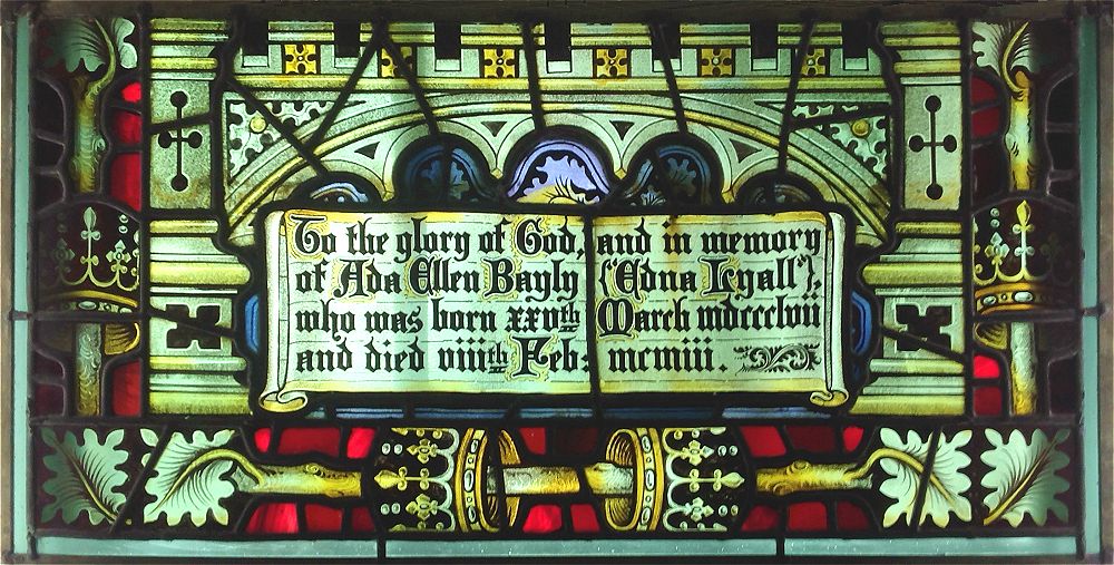 Ada Ellen Bayly? What is this all about?In 1983 or '84, when I lived in Ashford, Kent (England), I bought a large stained glass church window in an antique shop an hour's drive west from our home. I do not remember exactly where it was, but believe it might have been on the outskirts of Tunbridge Wells. The shopkeeper had two windows, of the same size, for sale and told me that they came from a church in the area (I can't remember the town's name), which had been demolished not too long ago. I bought the one, which I tough was the nicest and paid (I believe) just over £100 for it. He then also gave me a smaller window (but the same width), which belonged to the set, which had a dedication on it. I always wanted to install them somewhere in our home, but never came to it. Now, 30 years later, it has finally happened. It took some work however. Last year (2014) I had them cleaned, releaded and fixed in a thin steel frame. By now I had moved to a condo in Destin, Florida (USA) and installed them in the middle window of my office. It all fit perfectly in the window frame and looks so unusual and spectacular.
