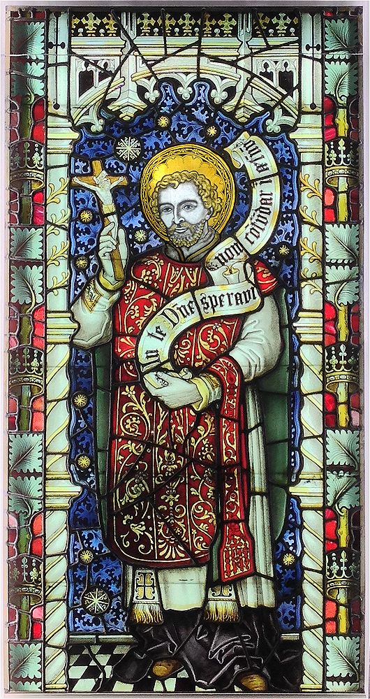Charles Eamer Kempe (1837 - 1907) was a very famous Victorian stained glass designer and manufacturer. The church suffered badly during W.W.II and was demolished in 1972. Several of the remaining church windows were then installed in neighboring churches in Eastbourne. So, we have the original windows from the St. Peter's Church in Eastbourne, which were designed and manufactured by Charles Eamer Kempe. They were one of the last windows made under his supervision before he died a few months later in 1907. Read more under the 6 top buttons and compare our window to other Kempe windows from the St. Peter's church and others. |