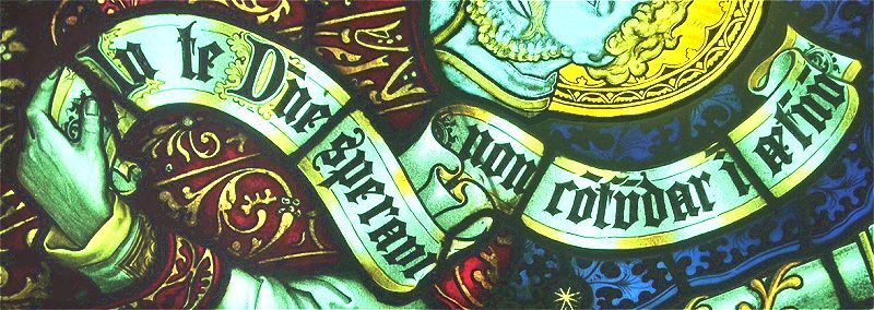The top dedication window measures 31 x 15.5 inches. I installed it above the main church window, because our condo's window frame accomodated that perfectly. The dedication states: To the glory of God, and in memory of Ada Ellen Bayly {"Edna Lyall"}, who was born xxv th Feb: mcmiii